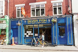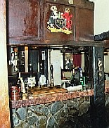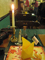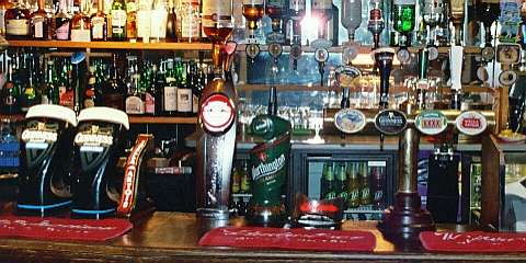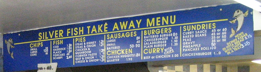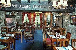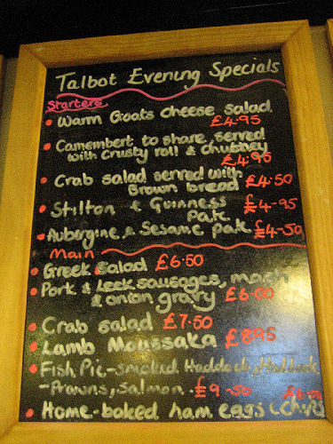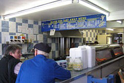フィッシュ・アンド・チップスの店 [上](左)外観(右)内部 (撮影:2005年ウェルッシュプールにて([中]も)) [中]店内にかかるメニューの一例。 魚は種類で注文するのがわかると思う。 この店の場合、1.80のようになっていれば、1ポンド80ペンス。 80となっていれば、80ペンスを表している。 [下]調理場(撮影:2006年サンゴセン<スランゴスレン>にて)。 調理場はたいてい、カウンター越しに眺めることができる。 ここでは手前の流しのような窪みが、たっぷりの油を満たしており、 客の注文にあわせてここで魚やジャガイモを揚げる。 夕食は、たとえ一人旅でも豪華に行きたいと思うならば、迷わずレストランへ。またパブでは夜に食事を出す店もある(ただし食事のラスト・オーダーは、パブの閉店時間よりも格段と早い)。この場合、地元の食事を堪能することが出来るチャンスに恵まれたと思えば、間違いない。なおパブでは、料理は運んでくれるが、飲み物はカウンターで頼み、その場で料金を払う方式(Cash On Deliveryという)をとっている店が多い。なお、食堂やパブでは水(ミネラル・ウォーター)は有料なので、そのつもりで。 ![]() たまには蝋燭の灯るレストランで食事はいかが。 (撮影:2007年8月、ベリューにて) 詳しくは、「ウェールズを食べる」のページを参照のこと。 ![]() その日のお勧め料理は黒板で確かめて(クリックで拡大)! (撮影:2007年8月、ベリューにて) パブ(Pub)とは、Public Houses、即ち、社交場(公共の家)の省略形だ。日本にある同名のものとは、全くことなるので注意。日本で言うならば、居酒屋、喫茶店、食堂の3つの機能を兼ね備えたのが、パブと呼ばれる社交場なのだ。 イングランド同様、ウェールズでもパブに人々が集う習慣がある。パブは11:00頃から開店し、23:00頃まで営業している註。2007年7月1日より、イングランドとウェールズでは禁煙法が施行された。これにより、パブ内は禁煙となったのでご注意を。入店の際、服装に気を使う必要は全くない。ドレス・コードはなく、普段着で楽しめばよいのだ。 ビールはひとつのパブで何種類も揃えており、開店時から飲むことが出来る。昼間でも、余裕があるならばパブに浸るためにも、エールをためらわず注文してみよう。 飲み物を注文する場合は、カウンター(左写真:撮影2003年中部ウェールズ)でバーテンにビールであるなら品名を告げ、料金と品物を引き換える(Cash On Delivery)。この際、サイズを告げよう。サイズは1パイント(0.568リットル)かその半分のハーフ・パイントである。たとえばウェールズのエールとして有名な"Brain"を1パイント注文する場合は、"One pint of 'Brain', please."と言って、注いでくれるのを待とう。注いでくれたならば、料金と品物を交換する。基本的にパブでは飲み物はセルフ・サーヴィスだから、席までは自分で運ぶように。 食事ができるパブもあるが、これらのパブでは大抵食事を出す時間が決まっている。つまり、パブは開店していても、時間によっては食事の注文できないこともある。またバーテンはいてもシェフが休んでいるために、食事が注文できないこともある。パブで夕食などを予定している場合は、注意が必要だ。またパブによっては、飲むための場所と食事をする場所(写真右下:撮影2003年カーナヴォン)を分けているところもある。大抵、21:00前に食事はラスト・オーダーとなる。 註・・・ 2005年2月にパブの24時間営業を許可する法案がイングランドとウェールズの議会で通過した。しかしながら現地の世論はこれに対し否定的である。 ウェールズの人々は、ひいきのサッカー・チームやラグビー・チームの応援には熱心だ。ことによると、イングランド以上に熱心かもしれない。パブのテレビで、サッカーやラグビーの試合中継をしている場合、応援に過熱気味の熱心なファンが集っていることは楽に想像できる。この場合、日本の虎キチの比ではないので、近寄らないほうが無難だ。また、パブの中には、夜にバンドが出演し生演奏をするところもあるが、残念ながらこれは稀だ。下の写真はともに偶然出くわしたものである。