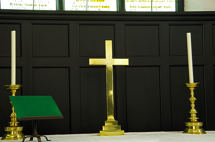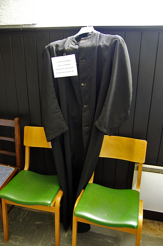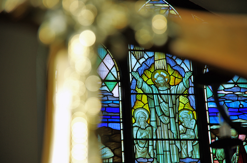 [Left to Right] (top)The Alter, "untenanted" cross and the stained glasses / "Tenanted" cross / Pews painted "matt black"However, he soon got annoyed by many small troubles among the people. Especially the frequent telephone ringing that interrupted his conversation bothered him so much that he needed to be alone. He would wander on Mr. Mappin's estate, Ynyshir, along the River Dovey. Wandering alone and seeing birds brought him a sence of peace and quiet. --"The swifts winnow the air./ It is pleasant at the end of the day/ To watch them. I have shut the mind/ On fools. The phone's frenzy/ Is over.' ("Swifts",Pieta)