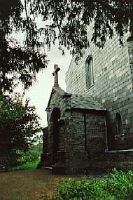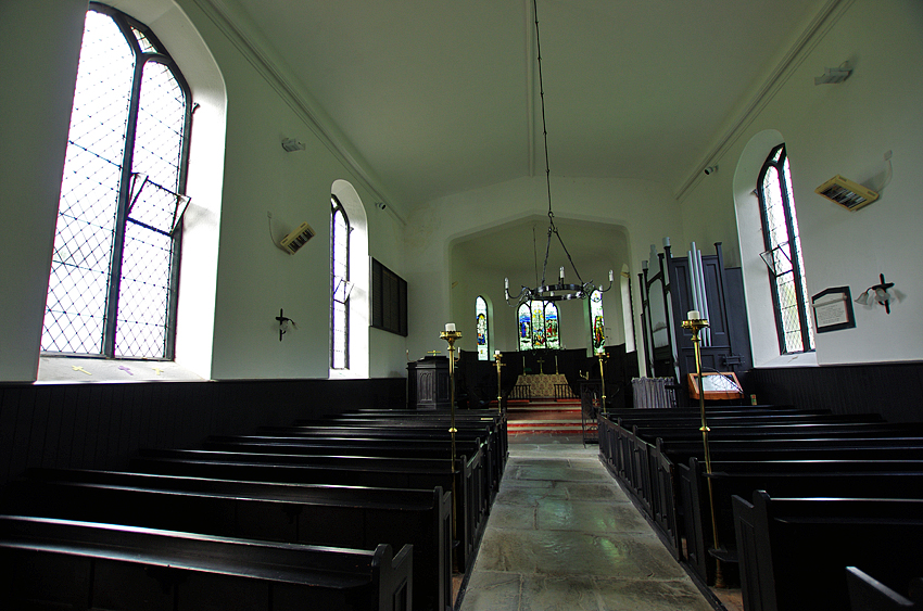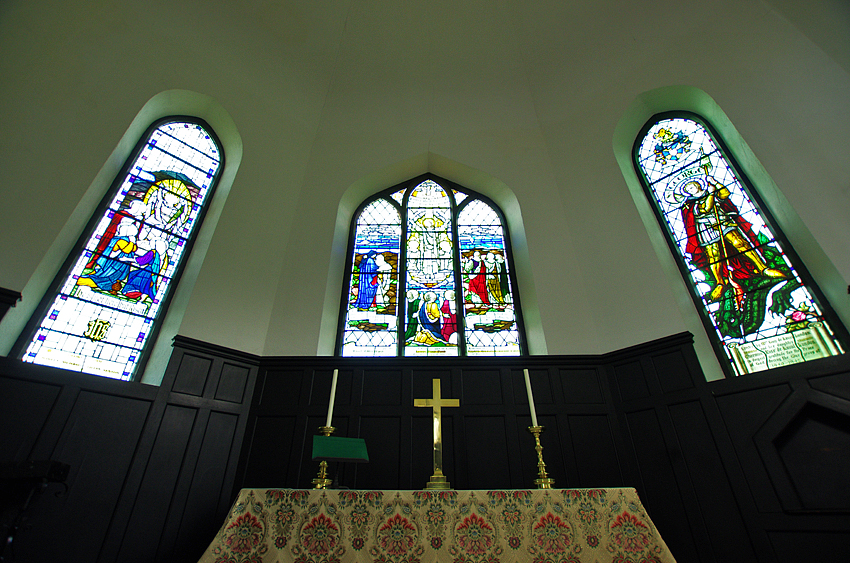 St. Michael's Church, 2014, (Click to Enlarge)St. Michael's church, different from the Manafon church among the hills, stands along the main road, A487. The churchyard is much bigger and it also has a wider nave than the Manafon church. Soon after arriving there, R.S. began to refurbish its interior; the red altar cloth was sold and the pew was painted "matt black". A memorable tablet on a wall near the organ was removed. He also wanted to get rid of a stained glass above the altar but, at last, gave up. 1