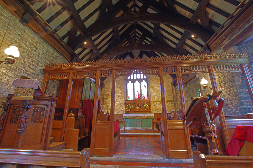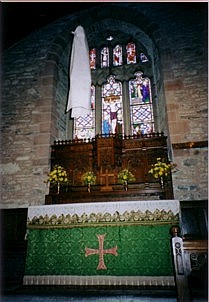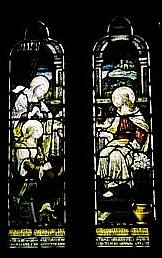 Photos [top]: Church of St.Michael's and All Angels** [upper middle] (left to right): The nave, The alter [lower middle] (left to right): Thomas's favorite desk and chair*, The pulpit*, The Saints in the south window of the church [bottom] (left to right): Ash tree, The River Rhiw All photographs were taken in 2002, except * ... taken in 2003 and ** ... in 1 September 2005. |
