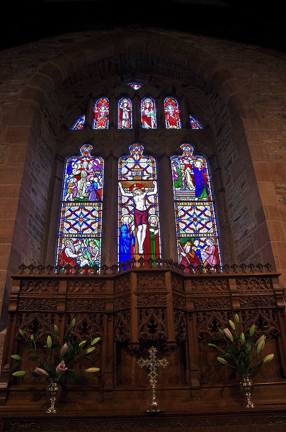 The stained glass in the east window,One of my great purposes of traveling in Wales in the summer of 2001 was to visit Manafon. A host of B&B in Llanfair Caereinion near Manafon kindly brought my friend and me to this small village by car. He set us down in front of a church, declaring there was no other building to see in this village. After he drove off, there was silence there. The silence was never broken, except for a black dog barking at me. The church stood firmly, surrounded by the hills. This was the church R.S. Thomas had served! I got really excited. I was also very impressed with silence there. I took out Song at the Year's Turning, a collection of poetry he had written here, and read some of them in the yard.