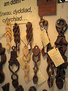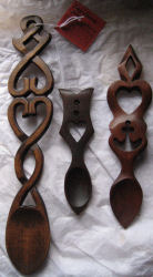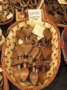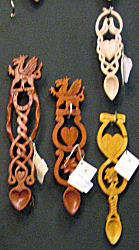 町中で見かけた様々な赤龍 (右→左)パブの看板(プタリ、Pwllheli)、ケータリングの車に描かれた赤龍(カーディフ)、 ミレニアム・スタジアム(カーディフ)にて。 (いずれも2007年9月に撮影) もともとラヴ・スプーンは、男性が女性に愛を告白するために、愛をこめ、一枚の板から切り出した木製のスプーンだ。柄に様々な模様(シンボル)を刻むことで、送り主/製作者の思いを伝える。南ウェールズで生まれた伝統だが、現在ではウェールズ全土で見られ、土産物の定番にもなっている。なお最も古い記録は、17世紀にさかのぼる。 柄に彫られた様々な模様。これがこのスプーンの特徴だ。最も定番な模様は、やはりハート型である。ハートがひとつだと「愛」、ふたつだと「だんらん」(もしくは「相思相愛」)を意味する。錨は「確実なる貞節」、鍵だと「永遠にしっかりと結ばれたふたり」、鐘と指輪は「結婚」、リボンは「終わりなき愛」、葉は「育ちつつある愛」、蹄鉄ならば「幸運を祈る」、ケルト十字は「信頼」(「誓い」もしくは「結婚」)をそれぞれ意味する。 現在では、ウェールズを代表する工芸品として売られており、土産物屋や専門店で手に入れることができる。ウェールズの民族の祭典アイステズヴォッドならば、かならずやその出店がある。なお小さいものなら値段は5ポンドくらいからあるが、少しでも形のこったものだと楽に10ポンドから30ポンドはする。50ポンドおよびそれ以上の値段のものもある。