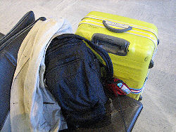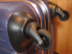 キャリーハンドル(写真左)とキャスター(写真右) 60リッター以上の容量のスーツケースであれば、スーツケース自体に5〜6.5キロほどの重さがある。例えば重量制限が23キロであれば、荷物に割り当てられるのは残りの13.5キロである。1週間以上の滞在の場合、これだけの少ない用量で一体どうやって旅をするのだ、と思う。何しろ最近は、電化製品まで持参しなければならないため、かさばらなくても重量だけは増えるという現象が起きる。以前の「着替えと日用品」のみで旅行ができた時代ではない。だが航空会社が時代遅れの対応を続ける限り、こちらのほうで損をしないように上手に立ち回る必要がある。このあたりのことも考慮に入れ、スーツケースは購入すべきである。 預け入れ荷物の重量制限 2007年以降、各航空会社で機内預けの荷物に対する重量制限が、厳しくなっている。以前は制限重量(※航空会社によって異なる)を多少超過しても見逃してくれた。だが最近では追加料金を徴収されるか、預け入れを断られる。 たとえば2011年08月現在、ブリティッシュ・エアウェイズやヴァージン・アトランティック航空でエコノミー・クラスを使用した場合、23キロ以上32キロ以下の預け入れ荷物には、40ポンド(※アメリカから搭乗する場合は60アメリカ・ドル)の追加料金が必要となる。32キロを超える荷物の場合は、受け入れそのものが拒否される。 私の場合、2007年8月に旅行した際には、イギリスまでの便は大丈夫だった。だがイギリスおよびアイルランドの国内線で、それぞれ日本円にして1万円近い額を徴収された。この経験から言えることは、出来るだけ荷物は軽く、ということだが、電化製品が必然的に増える昨今ではそれも難しい。航空会社のほうで現代という時代に合った対応を強く求める。 スーツケース・ベルト スーツケースに巻き、不用意に開いてしまうことを防ぐためのベルトだが、これを使用しているのは大抵日本人のようだ。一説によると、日本人かどうかを見分ける際に、向こうの人はスーツケース・ベルトを目印にしているらしい。これはあくまでも噂だが、本当ならば、日本人を狙った犯罪の標的にされる可能性が高くなる。 余談ながら私の場合、一回の旅行でスーツケース・ベルトが最後まで手許にあったことがない。大抵、最初の空港に着いた時点でなくなっている。 機内持ち込み 機内持ち込みの荷物は、通常、一人につきひとつである。これに加えて、ハンドバックかもしくはノートパソコンどちらか一つであれば一緒に機内に持ち込める。つまり機内には大小ふたつ鞄を持ちこむことが可能(※このふたつの鞄は、大ひとつ、小ひとつという計算になり、大ふたつは不可能だ。持ち込み許可のサイズに関しては、各航空会社の公式サイトを参照いただきたい)。この際、大きいバックの中に小さいバックを入れて持ち込むこと(例:バックパックの中にハンドバックを入れるなど)は、2011年8月現在、大丈夫だ。 注意したいのは、持ち込む荷物の大きさとその中身である。特に2001年の9.11アメリカ同時多発テロや、2005年のロンドン同時爆破テロ事件以降、その制限内容は厳しくなっている。大きさや持ち込み許可の方法に関しては、刻々と変わるので、詳しくは各航空会社や空港に訊ねてほしい。 この際、気をつけたいのは、日本の空港ではOKのものも、海外の空港では駄目の場合もあることだ。現地で国内線に乗り換える場合や、日本への帰りの際に影響が出るので、注意深くしたい。 最近では、鋭利な刃物のほかに、ライターやスプレー缶、ある一定量以上の液体やジェル状のものの持込が禁止されている。またアメリカの航空会社を使用する際には、空港内の免税品店で購入した液体製品(例:酒類や化粧品など)の持ち込みも禁止されている。注意が必要だ。2005年には眼鏡ケースが不可だった(註:かけて搭乗する場合はOK)ので、眼鏡をサングラスの両方を持ち込む場合、片方は機内預けに入れねばならず、不便だった。 なお写真用フィルムは、必ず、機内持ち込みにすること。そうしない場合は、強烈なX線を浴びて感光してしまう。・・・ とはいっても、最近の皆さんは、ほとんどデジカメなんですよね。 必須品 パスポート。これは長期/短期を問わず、必須。5年用と10年用の二種類がある。イギリスの場合、有効期限が「滞在日数プラス2ヶ月」以上なければならない。日本国籍をもっていて、6ヶ月以上の滞在ならば、ビザも必要になる(いずれも、2008年8月現在)。変更される場合もある。詳しくは大使館などに訊ねてほしい。 航空券もしくは航空券の引換書。高額なツアーでは添乗員が用意し、預かってくれるが、それ以外では個々人で管理するようになる。したがって首下げ式の貴重品袋(市販されている)などを利用し、身に着けておくことをお勧めする。この際、航空券は汗をかいた時のことを考えて、薄めのビニール袋で包んでから貴重品袋に入れよう。 この貴重品袋だが、長期滞在す