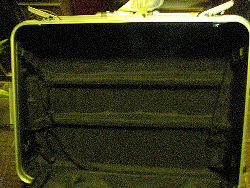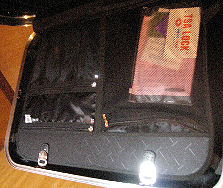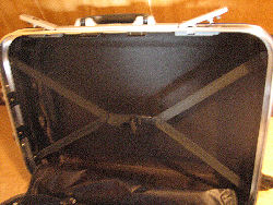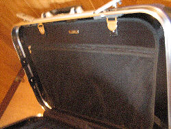 スーツケース内部 [上]仕切り幕。左のほうは3つのポケットに区切られている。 [下][左]キャリーハンドルの収納が内側に出っ張ったタイプ。[右]平面なタイプ