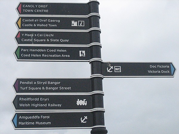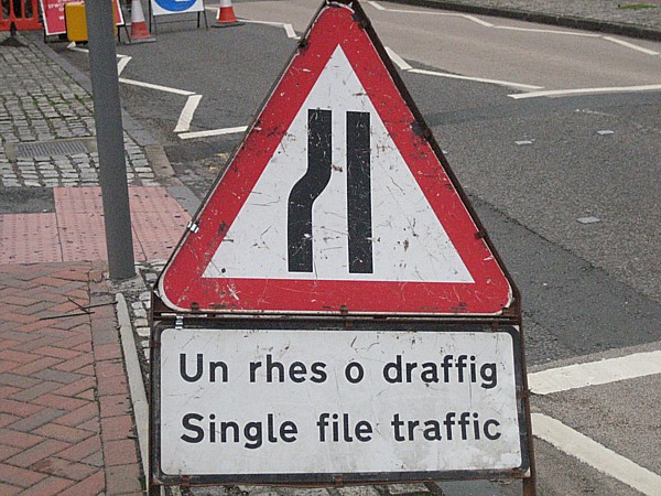 二重表記による交通標識の一例(撮影:カーナヴォン、2011年8月12日)(クリックで拡大) ウェールズ語教育 ウェールズ局(Welsh Department)とウェールズ省(Welsh Office;かつてイギリス政府内にあったウェールズを担当する部門。ウェールズ議会にその仕事は引き継がれた)は、第2次世界大戦終結より小学校および中学校におけるウェールズ語教育を推してきた。この省の働きかけから、1956年にフリントシャーに最初の英語とウェールズ語のバイリンガルで教育を行うYsgol Glan Clwydが開校した。 かつては英語が就職の鍵だったが、徐々に第2次世界大戦以降、ウェールズ語が雇用の窓口を広げるという考え方が出始める。ウェールズ語教育が行われる学校の需要も増す。その結果、1951-81年の間、ウェールズ語の話者数が減少する一方で、ウェールズ語教育を行う学校の設立は増加していった。実際に1956年にはウェールズ語教育をおこなう学校は先のフリントシャーのYsgol Glan Clwydのみだった。だが1990年には、20校へと増加。生徒数も1970年の2017人から1990年の12475人へと増えている。1975-80年には、クロイド(Clwyd)では95.5%の学校でウェールズ語が第一言語もしくは第二言語として教えられていた。 ウェールズ語のみで教育を行うか、ウェールズ語を学校での第一言語として教育を行っている小学校は、ウェールズ内全小学校のうち1990年の25.9%から1994年の27.5%へと増加。一方で、ウェールズ語を教えていない学校は1990年の14.2%から1994年の1.6%へと大幅減少している。 ウェールズ語を教える、もしくは、ウェールズ語を媒体として教育する教育機関が増加するというのは、ウェールズ語の使用推進のためには、非常に有利である。しかしその一方で、「学校の中だけのもの」となってしまう恐れがある。すなわち、日常生活で言葉が使用されなければ、言葉が真の意味で使用されているとは言えない。そこで2010年12月13日、ウェールズ議会は「生きている言葉。生活のための言葉」(A Living Language: A Language for Living.)というキャンペーンを始めた。端的に言えば、学校のみならず、職場や地域でのウェールズ語使用を促進し、言葉そのものの価値を高めようというものである。 ウェールズ語の現在 現在、ウェールズに住む人の約2割程度が、ウェールズ語を喋ることが出来ると言われている。南に行くほどその割合は低くなり、逆に北では高くなる。また、東西に見た場合、イングランドに近い東より西のほうが喋る人の割合も高い。すなわち、南より北、東より西の方が、喋る人口の割合が高いのが地理的特長である。同時にこのことは、南より北、東より西のほうがウェールズらしい文化が残っていることの現れともなる。 特にウェールズ語を日常的に喋る人々は、北西ウェールズに集中している。ある統計では南ウェールズの喋る人の割合が0〜2割であるのに対して、北ウェールズでは軒並み4割以上、そして特に北西ウェールズのスリン半島やアングルシー島では、その割合は7割を超える。 マスメディアとウェールズ語 現在、若者のウェールズ語への関心を引いたのは、マスメディアによるものとする説もある。1969年のウェールズ最有力レコード会社サイン(Sain)・レーベルの設立を皮切りに、1977年にウェールズ語専門のFM放送局BBCラジオ・カムリ(BBC Radio Cymru)が設立され、翌78年11月13日午前6:30に放送が始まった。 しかしそれでもテレビでのウェールズ語放送の時間は、少なかった。1年間にたった53時間だったのだ。愛国者を中心に、政府への圧力が続く。そして時の首相であり、その改革から鉄の女と言われたマーガレット・サッチャーがウェールズ語専門放送局の設立を許可する。そして1982年11月1日に、ウェールズ語のテレビ放送(S4C)('Sianel Pedwar Cymru')が始まった。これによりウェールズ語放送の時間は、500時間以上まで増大する。 S4Cは週に22時間、主にピークの時間帯を中心にウェールズ語の放送を行っている。 またS4Cは開局当初から若者文化に注目。その中でもロックやポップスに注目し、ウェールズ語のバンドを番組に登場させるなどして後押しし始める。このおかげで当時全く無名だったカタトニアやゴーキーズ・ザイゴティック・マンキ、スーパー・ファーリー・アニマルズなどのバンドが公共の放送電波に乗ることになる。その後、彼らの活躍はご存じのとおり。 彼らの人気や行動に注目が集まり、ロック、ポップスなどポピュラー・ミュージックでウェールズ語を使うバンドがそれまで以上に現れるようになる。そしてこれらのバンドを通じ、若者のウェールズ語への関心を高めているのである。 ウェールズ語委員会(Bwrdd yr Iaith Gymraeg / The Welsh Language Board) ウェールズ語委員会(Bwrdd yr Iaith Gymraeg / The Welsh Language Board)は「ウェールズ語の使用を促進し、また、助ける」ために1993年に設立された公的機関。様々な活動を通して、ウェールズ語の使用を国民に促してきた。2012年3月31日にその活動を終えた。 母体の発足は1980年代に遡る。この頃、ウェー