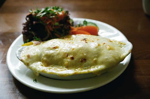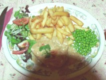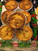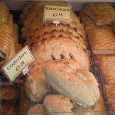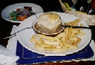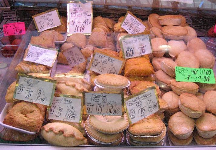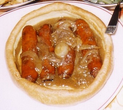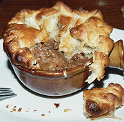 *ステーキ・アンド・エール・パイ(Steak and Ale Pie) ・・・ これもイギリスでの定番料理。サイコロ状に切った牛肉、玉葱、リーク(西洋葱)などをエールで煮込む。それをパイ生地で包んで焼き上げた料理。煮込むので大抵の場合は、アルコール分はとんでいるが、中にはかなり残っている(仕上げにアルコールを足したか?)ものもある。車を運転する場合には、ご注意を! (撮影:2007年8月10日、レクサム)*ヨークシャー・プディング(Yorkshire Pudding)