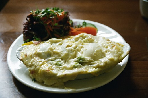 宿によって異なるが、大抵、オレンジかグレープフルーツなどのフレッシュ・ジュースやシリアル(コーンフレーク)が、数種類自由に選べるように、揃えられている。フレッシュ・ジュースで喉を湿らし、シリアルやヨーグルト、フルーツなどを食しながら、待つこと数分。薄切りのトーストと一緒に、直径30センチはあろうかという皿に、朝食が盛られて運ばれてくる。