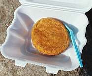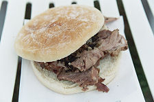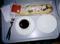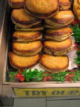 スーパーマーケットの食料品売り場に行けば、必ずといっていいほど、出来合いのサンドイッチ(下写真;撮影2005年カーディフ)が売られている。これはかなり安い。量も然程多くないので、連日の油料理で胃がもたれ気味の時など、重宝する。 パブやサンドイッチ専門店では、パンに挟む中身を注文するとその場で作ってくれる。注文された中身は、生野菜と一緒に挟んでくれるのが一般的。この際、食べたくない野菜があれば抜いてくれる。店によっては、パンを白かブラウンの2種類から選ぶことも出来る。パブや専門店で注文するサンドイッチは、非常に量が多い場合があるので注意も必要。 ![]() ![]() [上]出来あいのサンドイッチ(売店で購入)。 [下]サンドイッチといってもバーガータイプのものもある。 中身はマリン・ローズ・ソース(Marine Rose Sauce)をあえた小海老(shrimp)。この冷製のソースは海老のうまみを十分に引き立てる。(クリックで拡大) ・・・ パイ生地の中に、肉料理を詰めて焼いたもの。パイは中世に、イングランドの庶民の間から生まれた料理だ。中世では皿は高価で、庶民の手の届くものではなかった。その代用品として、庶民はパイを生み出した。実に皿を料理として作ってしまったのだ。今では密閉されたパイが主流だが、当時は蓋のない、いわば器だけのパイもあった。 当初は皿の代用品だったパイだが、蓋をつけ、中身を密閉することで別の役割も生まれるようになる。中身を密閉し、オーヴンの中で高温で焼かれたパイは、中身が空気に触れることがないため、日持ちがした。そのため旅などの携帯食として好まれるようになった。この名残か、今でも町中のみならず、駅周辺でパイを売る店をよく見かける。 現在、パイの具は鶏肉や牛の肉をミンチにしたものに、野菜を混ぜたものや、ベーコンと絡めたものなど、千差万別。日本のパン屋で「ミート・パイ」などとして売られているものと一緒と考えれば、ほぼ間違いないが、パイ生地は厚く、堅い。
