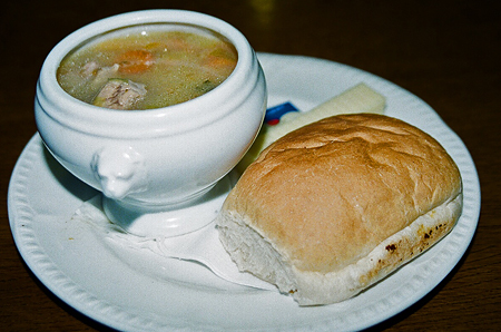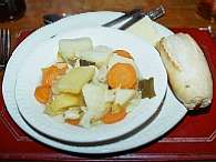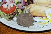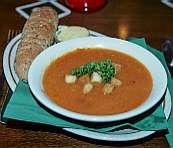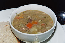 バラ・ブリス(右がバターを塗った状態) (撮影:2004年8月) ・・・ ウェールズに限らず、イギリス全土で見られる菓子。イギリスで暮らしたことのある人ならば、必ず食べたことがあるという代物だ。家庭で作るのが一般的だが(それ故にレシピもたくさんある)、店頭でもみかける。オートミールを原料に、大量のバターと蜂蜜(もしくは糖蜜)を混ぜ合わせたものを、オーヴンで焼いたビスケット菓子である。*アングルシー島のケーキ(Anglesey Cakes) ・・・ 小麦粉を使って円形に焼いた2つのパンでジャムを挟み、全体に粉砂糖を振りかけたもの。もともとは元旦に子供たちが近隣の家々を、新年を祝って尋ねた時にもらった菓子パンだ。その菓子パンのお礼に、子供たちは次のような歌を歌ったという。 ウェールズ語(原詩) / 英語訳 *マザーズ・サパー(Mother's Supper) ・・・ 本来は軽め夕食らしいが、ウェールズ人はお茶請けにもしてしまう。細かく切ったタマネギとチーズ混ぜ合わせた中身を、上と下からベーコンではさむ。それを容器にいれて、上のベーコンがカリカリになるまで焼いたものだ。これを茶請けにする(笑)? ディナー イギリスの料理は量が多いことで有名だが、ウェールズもその例に漏れない。いやむしろ、イングランドよりも量が多いこともある。そしてその多くは、自然の恩恵を十分に受けているのが特徴である。 前菜およびサイド・ディッシュ 前菜も、量が多い。メインがその後に控えていることを考慮した上で、注文しよう。2、3人で卓を囲むならば、前菜は1〜2品が適当かもしれない。 *カウル(Cawl) ・・・ カウルとはウェールズ語で、スープの意味。料理名にウェールズ語を冠しているだけあり、ウェールズの伝統料理としては名高い。ゆえにもともとは家庭内で作られていた料理だが、パブなどでも提供されることがある。カウルは羊の肉や野菜を煮込んだスープだ。それを一言で表現するならば、“豪快”。中に入っている肉や野菜は、大きな塊だ。それがいくつもゴロゴロ入っている。宮廷の洗練されたものではなく、農家の一般家庭で伝えられてきたことを思わせる豪快さだ。 現在では、普通のスープとして食されるカウル。しかしかつては、そうでなかったという。Bobby Freemanによれば、カウルは一旦調理された後、まず、スープ(煮汁)の部分のみが出された。そのスープが終わってから、肉と野菜のみが別の皿に盛られ、っ食されたという。つまりひとつの料理で、前菜とメインの両方の役割を果たしたのだ。 カウルに用意するのは羊(子羊)の肉と野菜。肉は牛肉でも良い。まずはウェールズ産の子羊の肉から脂肪を取り除き、狐色にフライパンで焼く。これを大き目の鍋に移し、水とハーブを加え一煮立ちさせた後、とろ火で煮込む。 その間にジャガイモ、豆、ニンジン、タマネギ、ウェールズを象徴する野菜であるリーキ(セイヨウネギ)などの野菜を、大き目のサイコロ状に切り分ける。とにかく豪快に、大きな塊に切ること。そしてリークを除いた野菜をフライパンで炒めた後、肉の入った鍋に移す。そしてとろとろになるまで煮込む。十分煮込んだら、仕上げの20分前にレタスとブロッコリーを入れれば完成。(左写真:2004年ニューポート(ペンブルックシャー)にて撮影) ![]() カウル (撮影:2007年カーディフ) ![]() カウルには大抵、パンがついてくる。チーズをあわせても良い。 (クリックで拡大:撮影、2011年8月、カーマーゼン) 豚の肝臓(レバー)と玉ねぎを刻み、水で2時間煮込む。そこにニンジン、カブラ、パースニップ、ジャガイモを切ったものを加え、さらに30分煮込む。こうすることで肝臓はピューレ状になり、スープとして食べやすくなる。 元来は、家畜の豚が死んだ時に作った料理。他の肉は焼いたり、腸詰めにしたりしたのだろうが、残った内臓までも奇麗に食するために考案されたのだろう。ブラック・プディングは、やはり、家畜の肉を捨てるところなく食べるために考案された料理だと伝えられるが、これも同じ理由だと考える。ちなみに膀胱は膨らまされ、子供たちがサッカー(フットボール)のボールのように蹴って遊んだとか。 *スープ(Soup) ・・・ ニンジンとコリアンダーのスープ、セイヨウネギ(leek)とポテトのスープ、セイヨウネギとキャベツのスープ、など千差万別。日替わりスープ(Soup of the Day もしくは Soup of the Night)を、メニューに持つレストランやパブも多い。大抵、スープと一緒にロール・パンがついてくる。もしウェールズを象徴する野菜のひとつ、セイヨウネギ(leek)を食材に使ったスープがあれば、是非とも味わってみたい。メニューで自家製(home-made)がうたわれていれば、その土地独自に伝わるレシピのスープに出会うことが出来るかもしれない。右の写真は、トマトとタマネギのベジタブル・スープ。クルトンとパセリがのせてある。(撮影:2004年ギルスフィールド) *チップス(Chips) ・・・ 大抵、メインを頼むと一緒についてくる。チップスはイギリス英語で、ポテ