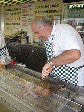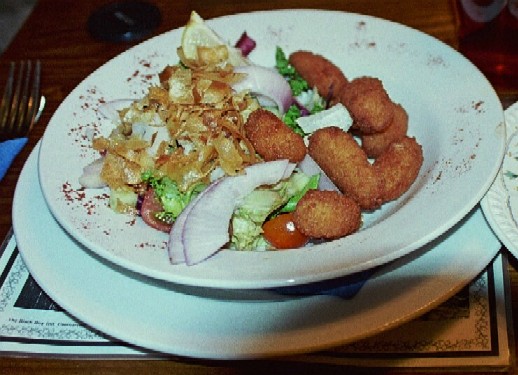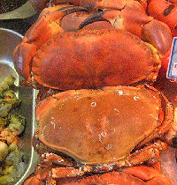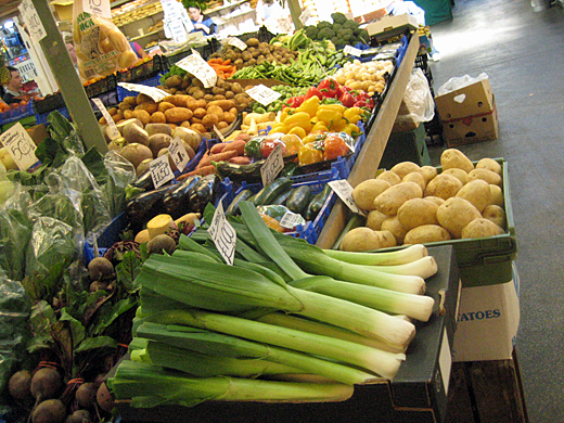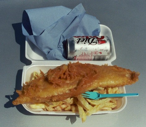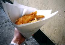 市場を彩る野菜たち。手前がリーク(西洋葱) (撮影:2007年カーディフ市場) (クリックで拡大) *海鮮料理(Seafood) 昼食の項目であげたフィッシュ・アンド・チップスも、もちろん、海鮮料理だ。だが3方向を海に囲まれ、山や丘の間を清流が縫うようにして流れるウェールズでは、魚介類を食材に使った料理が多くある。海のタラ(Cod)やマダラ(Haddock)、エビ(prown)が一般的なのはイギリス全土に渡って共通だが、ウェールズでは川で捕れる鮭(salmon)やマス(trout)も、人気のある食材だ。 北ウェールズでは、海に面した街や村が多く、そのため、海鮮料理は豊富である。特にアングルシー島(Anglesey)では、さまざまな伝統的なレシピが伝えられるのみでなく、その地勢を生かした新しい料理が地元のシェフによって開発されている。レストランで試してみよう。 *フィッシュ・アンド・チップス(Fish and Chips)
