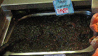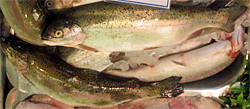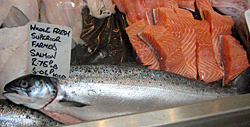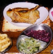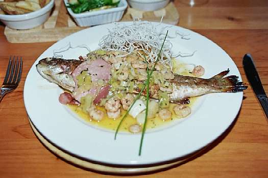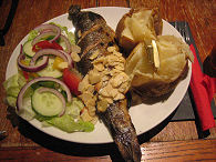 あつあつのところをタルタル・ソースをつけて口に放り込むと、衣のサクサク感と、対照的なそのぷりぷりとした食感がたまらない一品である。エールに似合う料理のひとつでもある。他の料理に較べて量が軽いので、私の場合エールを飲みながらだと、あっという間に食してしまう。やはりこれも、チップスや生野菜と一緒に出される。 *漁師の皿(Fisherman's Plate) ・・・ 魚に限らず、海の素材のフリッターをふんだんに盛った1品である。ポースマドックで出くわしたこの皿には、タラの切り身、スカンピ、イカの輪切り(いわゆるイカ・リング)、そして白魚の揚げ物が生野菜とともに山盛りになって出てきた。痛みやすい白魚が食べられるとは港町ならではであるが、同時にそれはこの皿の食材が新鮮なことをも意味する。ウェールズの自然とそこに暮らす人々に感謝しながら食した1品である。 *ウェールズ風マスのベーコン包み(Welsh Trout in Bacon) ・・・ マス(trout)は、ウェールズでは川魚の代表的存在。そのためウェールズでは、フライやルアーによるマス釣りもさかんである。そのようなマスを味わうのに、最適なのがこの料理だ。かつてウェールズの農夫たちは、川で捕れたばかりのマスを、自家製のベーコンで包んで焼き、この料理を楽しんだそうだ。腸(はらわた)を抜いたマスの上からバター、パセリ、レモンの輪切り、黒胡椒をのせれば、下準備は完了。それを更にベーコンをぐるぐると巻きつけ、その上からバターをのせ、オーヴンで焼けば出来上がりである。いかにも無骨な男たちの、豪快でありながら、魚本来の味を損なわない料理だ。ポテト、ニンジンなどの付け合せで召し上がれ。 左の写真は、2004年コンウイのウェールズ伝統料理専門レストランで撮影(クリックで拡大)。伝統的な料理法に忠実に従いながらも、小エビをあしらうことで、ワインの似合うお洒落な料理となっている。 *マス料理(Trout) ・・・ パブやレストランで、一般的に見かけるメニューはこちら。バターでソテーするのが、一般的な料理方法。もしメニューで“local”という一言がついていれば、それは地元で採れた魚であることを意味する。 ![]() ニジマス (撮影:2007年カーディフ市場にて) ・・・ ソテーしたマス(地元産)に、アーモンドの炒め物をあえた一品。アーモンドは、マスをソテーした後の油(バター)で炒めてある。淡白な味のマスを、アーモンドの甘さが彩る料理だ。(撮影:2006年スランゴスレン)*鮭料理(Salmon) ・・・ もちろんウェールズでも鮭は魚料理の定番。かつては牛乳で煮たそうだ。だが今日ではオーヴンで焼いたり、フライパンで炒めたものが好まれる。いくつかレシピ本から料理を紹介しよう。 [鮭のホイール焼き(Baked Salmon)] ... 鮭を1匹用意する。胃などの内臓を取り除き、良く洗う。これを腹側からふたつに割き、そこに塩、こしょうをふりかけ、スライスしたレモンにパセリを並べる。これをバターか油を塗ったフォイルに横たえ、さらにパセリとレモンを表面に載せる。これをオーヴンで40分焼く。焼きあがったら肉のみを皿に盛り、マヨネーズとレモン、ヨーグルトなどから作ったソースをかけて食す。 [鮭の皿焼き(Welsh Plated Salmon)] ... “イギリスで最も小さい家”に伝わる料理。防火皿に鮭を載せ、2匙分の牛乳を加え、多いをする。フライパンに沸騰した湯とジャガイモとアスパラガスを入れ、更にその上から先ほどの皿を載せ約20分、蒸し焼きにする。出来上がったら皿をそのまま食卓に乗せ、茹でたジャガイモ、アスパラガスを添え物にする。 ![]() 鮭 (撮影:レクサムの肉屋市場) ・・・ 前菜や軽い夕食(supper)でも出される、ゴーアー半島に伝わるシチューだ。もともとは朝捕れた魚を家に持ち帰った漁師が昼寝をしている間に、妻がそれらを煮たシチューである。 トリガイ、マダラなどの白身魚、カニ肉、エビ、タマネギを白ワインと水で大鍋を使って煮る。煮込みすぎる前に、溶かしたバターとサフランを加え、火から降ろすのがこの料理のミソ。 *魚のパイ(Fish Pie) ・・・ あらかじめ骨や鱗を取り除き、調理された白身魚を、固ゆでのゆで卵やスライスされたトマト、パセリなどとともにマッシュ・ポテトで包み、焼き上げた料理。 *オイスターマウス・パイ(Oystermouth Pie) ・・・ ディラン・トマスが「醜くも愛すべき町」と呼んだスオンジーにある、海岸沿いの町の名を冠した料理は、魚のパイ包み焼きだ。 骨と鱗を取り除いたタラの身と、マッシュ・ポテト、タマネギ、固ゆでの卵を混ぜ合わせた具を、パイで包み焼き上げたもの。もともとタラは、塩漬けのものをつかっていたそうだ。 *トリガイのパイ(Cockle Pie) ・・・ 数百種類貝料理の中で、最も有名なものだそうだ。あらかじめ茹でた向き身のトリガイを、ベーコン、タマネギ、シャロットなどと一緒にパイ生地で包み、焼いた一品。 *ペンブルークのトリガイ(Pembroke Cockle) ・・・ トリガイはウェールズの魚屋ではどこでも買えるほど、定番の食材だ。