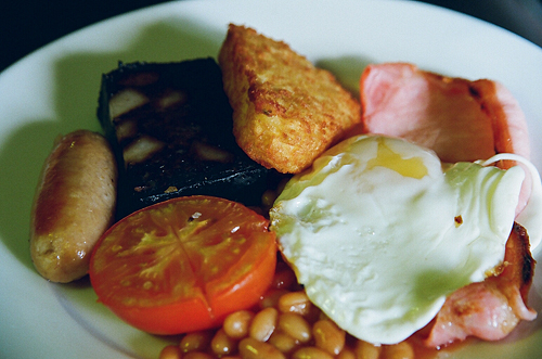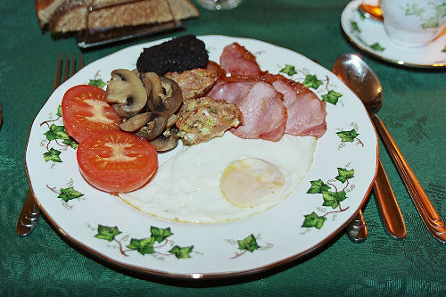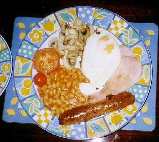 ――ウェールズの料理あれこれ―― 食事は土地から生まれ、人を作る。 食材が世界各地から取り寄せ可能になった今でも、普段人が食べるものはその土地で生まれたものだ。 すなわち土地のものを味わうことは、その土地、ひいてはそこに暮らす人々の理解を助ける。 そのようなわけで、今日も食を求めて私は行く。 決して食い意地だけが張っているわけではないので、そのあたり、ご理解のほどを(笑)。 普段、ウェールズの人たちはシリアルやフルーツ、トーストなど簡単なもので、朝食を済ますことが多いようだ。ここにあげたメニューは伝統的なものだが、ホテルやB&Bの朝食には欠かせないものばかり。 *イングリッシュ・ブレックファースト(English Breakfast) ・・・ 日本の朝食はファースト・フードに近い簡素なものだ。実際のイギリス人もシリアルだけなど、非常に簡素である。だがイギリスの“宿”で出される朝食はじっくりと食べる価値のあるものであるし、また、量も多い。私のように食の細い人間ならば、朝食をしっかり食べると、昼食が必要無いほどの分量だ。
