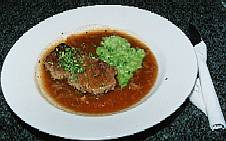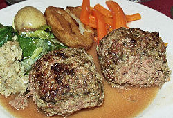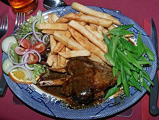 ![]() [上]ラムとミント・ソース [下]ローストしたラムにナイフを入れる料理人 (2007年8月10日、アイステズヴォッドの会場にて) ![]() ラムのチョップ(2006年中部ウェールズ) (クリックで拡大) ・・・ ウェールズの古い料理のひとつ。春を迎えたばかりの、まだ関節の柔らかい子羊を使った料理が、伝統的なものとされる。 ニンジンとサイコロ状に切った子羊の肉を、パセリ、季節の野菜、そして子羊の骨からあらかじめとったスープと一緒に、パイで包み、焼いた料理。マッシュ・ポテトとグリン・ピースの付け合せとともに、召し上がれ。 *モンマース・シチュー(Monmouth Stew) ・・・ 輪切りのセイヨウネギ、子羊の肉、パセリ、ハーブを煮込んだシチュー。ハーブは風味付けなので、食べる前に取り除かれる。 *ビーフ・ステーキ(Beaf Steak) ・・・ 説明は不要でしょう。定番中の定番料理。もちろん、地元で育てられた牛を使っていることは、言うまでもない。グラムではなく、オウンス(oz)で注文する。オウンスは約28.3グラム。 *ファゴット(Faggot)