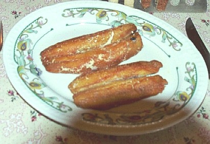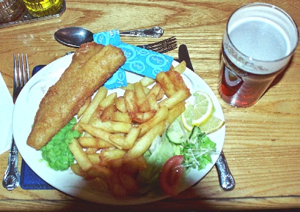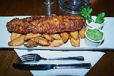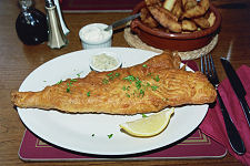 基本的には持ち帰り商品と代らないが、レストランやパブで出される場合は皿に盛られてくる。ナイフとフォークで食べることを考慮したためか、持ち帰りのものよりも、こんがりとあげられた魚とチップスが、大きな皿の大部分を占める。更にその周囲を茹でたグリン・ピースや煮野菜が、固める。ただし、ここ数年では煮野菜ではなく、生野菜である場合が多い。 持ち帰りでは塩とヴィネガーで食すのが普通だが、レストランなどで食べる場合は、他にケチャップ、マヨネーズ、タルタル・ソースなどが選べる。ビターやラガー系のビールと一緒に食べると、味は格別。二段も三段も、揚げ魚の味が跳ね上がり、舌が踊ること請け合いである。 海の近い港町や漁村を訪れた場合には、是非ともお勧めのメニューである。特に、西部や北部の海に面した町や村で出されるフィッシュ・アンド・チップスは、格別。魚が新鮮なのは言わずもがなだが、その身の引き締まり具合にロンドンなどで食べるものとは、格段の差がある。 ![]() ディップもついて、お洒落な料理に化けることもある (撮影:2005年8月、カーディフにて) ![]() ハドック(鱈の一種): ハドックは同じ鱈のコッドに比べかなり淡白である。 (撮影:2007年8月11日、レクサムにて) ・・・ “Battered”とは衣(batter)をつけて油であげることを、“Fillet”は魚ならば切り身を意味する。同じ項目のフィッシュ・アンド・チップス参照。 *スカンピ(Scampi)