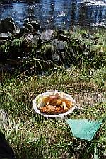 しかしここ数年、プラスチックの容器にフォークをつけて出す店が多くなった(註:フォークは有料の店もある)。食べやすくはなったが、なぜかこの容器を見るとワクワク感が薄れる。それというのも、この容器が日本の弁当屋(いわゆるホカ弁)で使っているものとそっくりなのだ。出来れば、以前のスタイルで食べたい。 ![]() テイク・アウェイならば清流のそばでも食事が出来る。 (2005年スランベリスにて撮影) ・・・ イギリスのパンは不味い、と良く言われる。だが、それは偏見と言うものだ。実際に一口かじってみればわかる。日本のパンよりは小麦が濃く、遥かに美味い。ただ、イギリスのパンが他のヨーロッパ諸国のパンに較べて、味が落ちるのは事実のようだが。