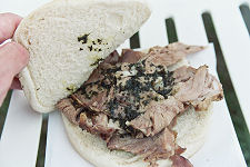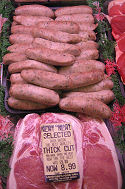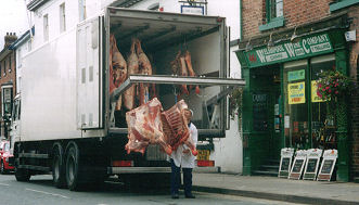 ウェールズの食卓を飾る肉たち――[左上]ブラック・ソーセージ [右上]ソーセージと厚切りの肉 [下]肉の配達中 (いずれも撮影はウェルッシュプールにて。上が2005年、下が2001年) ・・・ Lambとは子羊のこと。ウェールズの羊は世界的にその名が知られるが、地元での伝統的な羊料理と言うとこのウェールズ風ロースト・ラムになる。 これはウェールズの子羊の足に蜂蜜を塗り、塩と胡椒で味付けした上でローストした料理だ。羊を焼いた後の肉汁に、リンゴ酒と蜂蜜を混ぜて作ったグレイヴィー・ソースで食す。ウェールズの丘で放牧された羊の引き締まった肉を楽しむには、最適の料理か。考えただけで、涎がわいてきた(笑)。 *ラム(子羊)(Lamb) ・・・ ラムの料理はいくつかあるが、定番ともいえるのが子羊の肉をローストしたものだ。これにお好みのソースをかけて食べるのだが、ウェールズでは誰に聞いても「ミント・ソース!」という答が返ってくる。 それもそのはず、羊は草を食べて育つが、その中に天然のミントが含まれる。即ち、食べて育ったものと一緒にあわせるのが、一番美味い。これがイギリスの料理に対する考え方である。