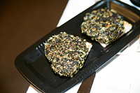 ![]() ウェルッシュ・ブレックファーストの一例<クリックで拡大> ソーセージの代りにウェールズの伝統料理である、豚肉とリーキのナゲット及び ブラック・プディングがついている(画面上部中央) (撮影:2004年コンウィのB&B) ![]() ウェルッシュ・ブレックファーストのいち例<クリックで拡大> 画面奥:ソーセージ、ブラック・プディング、揚げパン、ベーコン 手前 :トマト、ビーンズ、目玉焼き (撮影:2011年レクサムのB&B) ・・・ 鮭やマスが豊富なウェールズでは、朝食のメニューにそれらの燻製が入っていることもある。イングリッシュ・ブレックファーストに飽きた時や、軽く済ませたい時には最適のメニューである。シリアルやフレッシュ・ジュースなどが付くのは、イングリッシュ・ブレックファーストと変りはない。また、燻製といってもその身は柔らかく、火を通してから出されるので消化もいい。トーストも一緒に出されるので、燻製とトーストを交互に味わうと、湿った食感と乾いた食感がそれぞれ楽しめ、朝からリッチな気分になる。 イングランドの宿では見かけないメニューなので、ウェールズを訪れたら一度は試してみたい。 感覚としては、日本の民宿で朝食に出るアジの干物に近いか? *卵料理(Eggs) ・・・ フル・ブレックファーストの代りにスクランブル・エッグなどを、試してみるのも一興。ホテルでは、メニューにポーチド・エッグがあることもある。 *ラヴァブレッド(Laverbread) ・・・ ラヴァ(laver)とは、ウェールズの海辺の岩場で採れる海草である。この海草は、ウェールズで、特に南ウェールズの海沿いの町で有名だ。海草そのものは、小さく切ったものをバターで炒め、レモン汁で食べても美味。 ここで紹介するのは、このラヴァを使ったパンのような揚げ物だ。ラヴァとオートミールを混ぜ合わせたものを小さくダンゴ状に丸め、平たく潰し、ベーコンを焼いた後のの油で揚げる。この揚げ物は、ベーコンと一緒に食卓に出される。朝食に出すのが普通だが、軽い夕食(supper)で出されることもある。 ![]() ラヴァブレッド(撮影:2011年8月、カーディフのホテルにて) ![]() ラヴァブレッドの元となる海藻ラヴァ (撮影:2007年カーディフ市場) 大抵のパブには、ランチ・メニューがある。また持ち帰り(take away)専門店も、少し大きめの町ならば必ず見かける。ここに上げたメニューは、何も昼食用に限定されたものではなく、夕食として立派に通用するものも多い。またここにあげた以外にも、イングランドで出されるランチ・メニューなら、大抵の場合、ウェールズでも食べられる。 *フィッシュ・アンド・チップス(持ち帰り) (Fish and Chips for take away) ・・・ 訪英経験がある人なら、一度は食べたことのあるメニューだろう。それほどイギリスでは定番のファースト・フードである。ウェールズもその例に漏れない。 ファースト・フードには違いないが、これがあなどれない。レストラン、パブ、または持ち帰り用の専門店など、このメニューを扱う店は多い。むしろイギリス・ウェールズ料理の店で、このメニューがない店を探すほうが難しいくらいだ。