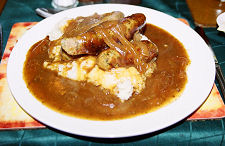 ・・・ 豚や羊の内臓を使った肉団子だ。内臓とタマネギのミンチを、セージ(サルビア)など季節の野菜と一緒に混ぜた具を丸め、焼いたもの。グレーヴィー・ソースで食す。堅く締め、水分を抜き、焼いた肉団子は携帯に向いていた。そのためかつて炭鉱夫らは、ファゴットを弁当として地下の坑道に持ち込むことを好んだという。左の写真は2005年8月、カーディフで撮影。レストランで出されたものだが、予想以上に柔らかく、素朴な味だった。 ![]() 2007年9月、スランドリス(Llandoris)で撮影。 ・・・ ウェールズに限らず、イギリス全土での定番料理だ。グレービー・ソースをたっぷりと敷いた海の中央に、マッシュ・ポテトの山を作る。その上に数本のソーセージを豪快に載せた一品である。ソーセージの直径は3センチを超えるものが多く、日本のそれを想像していると、驚かされること請け合いだ。ロンドンなどで注文すると、それなりにお洒落なスタイルで出されるが、ウェールズではそれは当てはまらない。下の写真(撮影:2006年ベリュー)から見て取れるように、農夫の食事を思わせる素朴かつ豪快な一品となる。 ![]() ![]() その名もケルト風ソーセージ(左)と、豚肉とリークのソーセージ。 (撮影:2007年カーディフ市場) ・・・ 豚は羊が広まる以前、ウェールズでは貴重な家畜だった。牛が一般的な家畜であったのに対し、豚は貴重種。それは『マビノギオン』第4話で、アンヌーヴンから贈り物として贈られた豚を求めて争いが起きるほどである。故に豚料理に、ウェールズ語と英語の両方からなる名前がついていても不思議ではない。 豚肉の切り身に衣をつけ、バターで両面がきつね色になるまで揚げる。それを鍋に移し、トマト・ソース(大サジ2)、スープ(肉系の固形スープを溶かしたもの)、月桂樹に塩、胡椒を加えて蓋をする。そして180℃で約1時間焼く。最後に小さなキノコを加える。これがベイノ・ポークである。してみると、ウェールズ風焼き豚カツかな? *ハーベスト・ホット・ポット(Potes Mis Medi / Harvest Hot Pot) ・・・ 大きな深鍋を火にかけ、その内側でバターを溶かす。ベーコンや角切りの子羊の肉をきつね色になるまで炒め、そこに人参、ジャガイモ、リーク、玉ねぎ、カブラなどの野菜を切ったものを入れ、香辛料とたっぷりの水を加える。それを弱火で2時間煮込めば、出来上がり。実にウェールズらしい料理だ。 この料理はジャガイモの収穫期に作られた。鍋ひとつで料理が済むうえに、複雑な工程や微妙な温度加減などが不要のためである。つまり料理の下ごしらえをした鍋を火の上に放置し、その間に収穫に専念する。そうすることで夜遅くに畑仕事から帰ってきても、夕食にすぐにありつけるというわけだ。 余談ながら、かつてウェールズの学校には「ポテト収穫ウィーク」(Wythnos Hela Tatws)があったとか。この時に親子総出で畑に出かけ、一日働き、帰ってきてからこの料理に舌鼓を打ったことだろう。 *ステーキ・アンド・キドニー・パイ(Steak and Kidney Pie)