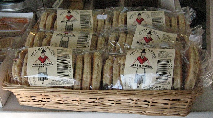土産物屋にて。ウェールズの伝統衣装を着た女性を印刷したラベル(右写真;クリックで拡大)からも、 伝統色を打ち出そうとする意図が読み取れる。 (2005年ウェールズで撮影) ![]() 2007年アイステズヴォッドに出店中のレストランにて撮影。 *バラ・ブリス(Bara Brith)