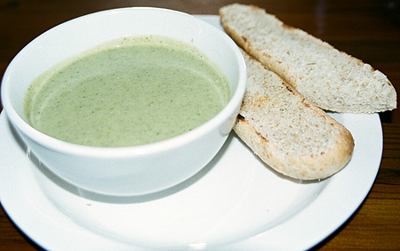 ――ウェールズの料理あれこれ―― スープはウェールズのみならず、イギリスおよびアイルランド全土で食べられる。フランスのスープのような透き通ったものは期待できないが、その半面、素材のうまみが存分に抽出されたスープを味わうことができる。 *カウル(Cawl) ・・・ カウルとはウェールズ語で、スープの意味。料理名にウェールズ語を冠しているだけあり、ウェールズの伝統料理としては名高い。ゆえにもともとは家庭内で作られていた料理だが、パブなどでも提供されることがある。カウルは羊の肉や野菜を煮込んだスープだ。それを一言で表現するならば、“豪快”。中に入っている肉や野菜は、大きな塊だ。それがいくつもゴロゴロ入っている。宮廷の洗練されたものではなく、農家の一般家庭で伝えられてきたことを思わせる豪快さだ。 現在では、普通のスープとして食されるカウル。しかしかつては、そうでなかったという。Bobby Freemanによれば、カウルは一旦調理された後、まず、スープ(煮汁)の部分のみが出された。そのスープが終わってから、肉と野菜のみが別の皿に盛られ、っ食されたという。つまりひとつの料理で、前菜とメインの両方の役割を果たしたのだ。 カウルに用意するのは羊(子羊)の肉と野菜。肉は牛肉でも良い。まずはウェールズ産の子羊の肉から脂肪を取り除き、狐色にフライパンで焼く。これを大き目の鍋に移し、水とハーブを加え一煮立ちさせた後、とろ火で煮込む。 その間にジャガイモ、豆、ニンジン、タマネギ、ウェールズを象徴する野菜であるリーキ(セイヨウネギ)などの野菜を、大き目のサイコロ状に切り分ける。とにかく豪快に、大きな塊に切ること。そしてリークを除いた野菜をフライパンで炒めた後、肉の入った鍋に移す。そしてとろとろになるまで煮込む。十分煮込んだら、仕上げの20分前にレタスとブロッコリーを入れれば完成。(左写真:2004年ニューポート(ペンブルックシャー)にて撮影) ![]() カウル (撮影:2007年カーディフ) ![]() カウルには大抵、パンがついてくる。チーズをあわせても良い。 (クリックで拡大:撮影、2011年8月、カーマーゼン) 豚の肝臓(レバー)と玉ねぎを刻み、水で2時間煮込む。そこにニンジン、カブラ、パースニップ、ジャガイモを切ったものを加え、さらに30分煮込む。こうすることで肝臓はピューレ状になり、スープとして食べやすくなる。 元来は、家畜の豚が死んだ時に作った料理。他の肉は焼いたり、腸詰めにしたりしたのだろうが、残った内臓までも奇麗に食するために考案されたのだろう。ブラック・プディングは、やはり、家畜の肉を捨てるところなく食べるために考案された料理だと伝えられるが、これも同じ理由だと考える。ちなみに膀胱は膨らまされ、子供たちがサッカー(フットボール)のボールのように蹴って遊んだとか。 *野うさぎのスープ(Hare Broth) 野ウサギの肉に、蕪、ジャガイモ、西洋ねぎを一緒に煮込んだ料理。味つけは塩だけというシンプルなものだが、野うさぎの肉が骨から自然に離れるまで煮込むので、スープには野うさぎの旨味が凝縮されている。 古くはこの野うさぎのスープは、大ご馳走だった。食べる際に、野うさぎの肉は別途、更に盛りつけられたという。こうすることで、野うさぎの肉を煮た料理と、野うさぎの肉から出汁をとった野菜スープの二品が同時に出来るというわけだ。 *守銭奴の饗宴(Miser's Feast) ベーコン、ポテト、蕪、西洋ねぎ、にんじん、玉ねぎなどをスープで煮込んだ料理。塩胡椒で味付けただけの素朴な料理だ。 この料理の由来は、カーディガンシャーにかつて住んでいた、ある裕福な老人の食事に由来する。この老人、金を節約するために、このスープを作り、月曜日に肉を食べ、野菜を火曜日に食べ、残ったスープを水曜日に飲んだそうだ。 *日替わりスープ(Soup of the Day) ・・・ イギリス・パブ・ランチの定番メニューのひとつで、ウェールズでも欠かせない。深めのボール皿に注がれたスープにパンが一緒についてくるのも、イングランドと同じ。ただ田舎料理の印象が強いのが、ウェールズで出されるものの特徴。 *スープ(Soup) ・・・ ニンジンとコリアンダーのスープ、セイヨウネギ(leek)とポテトのスープ、セイヨウネギとキャベツのスープ、など千差万別。