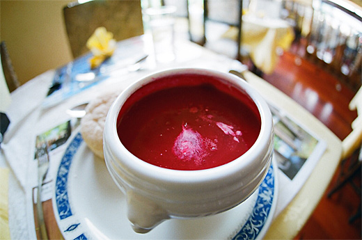 日替わりスープ(Soup of the Day もしくは Soup of the Night)としてその時期に合わせたスープを提供するレストランやパブも多い。大抵、これらスープには、ロール・パンやバターが一緒についてくる。もしウェールズを象徴する野菜のひとつ、セイヨウネギ(leek)を食材に使ったスープがあれば、是非とも味わってみたい。メニューで自家製(home-made)がうたわれていれば、その土地独自に伝わるレシピのスープに出会うことが出来るかもしれない。 右の写真は、トマトとタマネギのベジタブル・スープ。クルトンとパセリがのせてある。(撮影:2004年ギルスフィールド) ![]() アスパラガスのスープは夏の定番! 冷製スープもある。 (クリックで拡大:撮影、2011年8月、カエルレオン) ![]() 紅い色にドキッとするが、れっきとしたビートのスープ。(クリックで拡大:撮影、2011年8月、サンゴセン<スランゴレン>)
